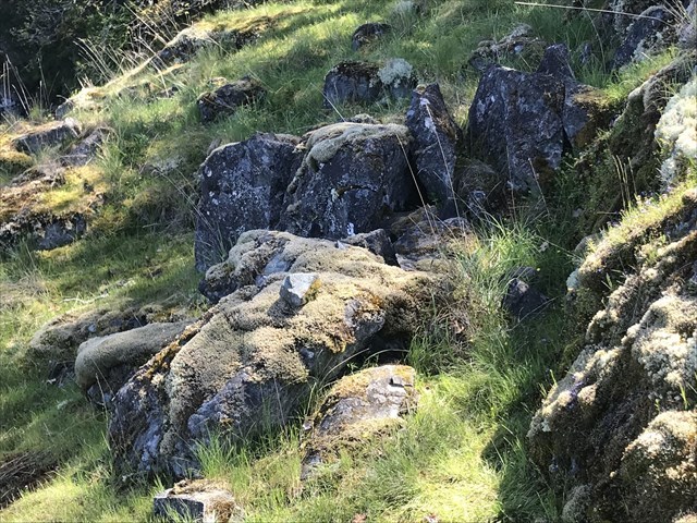 The rough and rugged coastal, yellow flagged, trail zig-zags through stands of cedars and sword ferns, across small ravines and stream beds and eventually pops out on the bluffs of Sansum Narrows. This trail winds along the shoulder of Maple Mountain along a narrow foot path. One creek crossing is highlighted by a photogenic log bridge and seasonal waterfall. There are numerous hidden natural hazards along the trail. It can require careful footing on some sections of irregular rock out cropping and along stretches that are slippery with mud and moss during the winter and after a heavy rainfall.