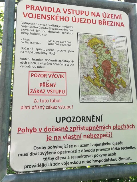 POZOR – cache se nachází ve vojenském újezdu Březina - v části přístupné s časovým omezením. Do uvedených prostorů je vstup časově omezen na pátky, soboty, neděle a státem uznané svátky takto: pátek od 15:00 hodin do 22.00 hodin soboty, neděle a státem uznané svátky od 06.00 hodin do 22.00 hodin Volný vstup do přístupných částí vojenského újezdu s časovým omezením není v těchto dnech vázán na povolení ke vstupu osob a vjezdu cyklistů. Viz. foto