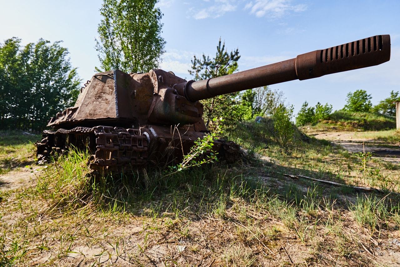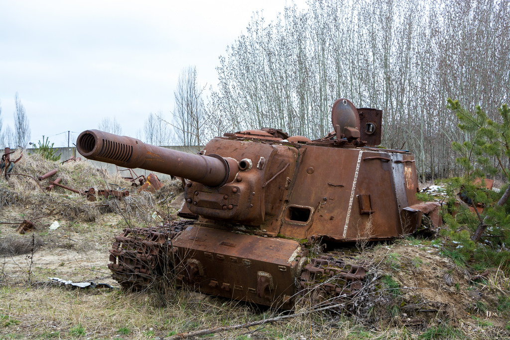 The ISU-152 is a Soviet self-propelled gun which was used during World War II. It was unofficially nicknamed Zveroboy (eng. “Beastsslayer”). ISU-152 was used as mobile artillery to support infantry, and for destroying heavy tanks and fortified positions. In 1986 the dozen of “Beastsslayers” were redeployed into the Chernobyl Exclusion zone soon after the accident. Liquidators planed to use them for making a hole in the unit 4 wall. It was necessary to pomp out water from compartments under the destroyed reactor. This plan was canceled but several of this vehicles where used to demolish building by driving into them during the cleanup actions. And now one ISU-152 number 100 stays closely to the ChNPP. It is abandoned and partially dismantled reminding us about two different periods of straggle.