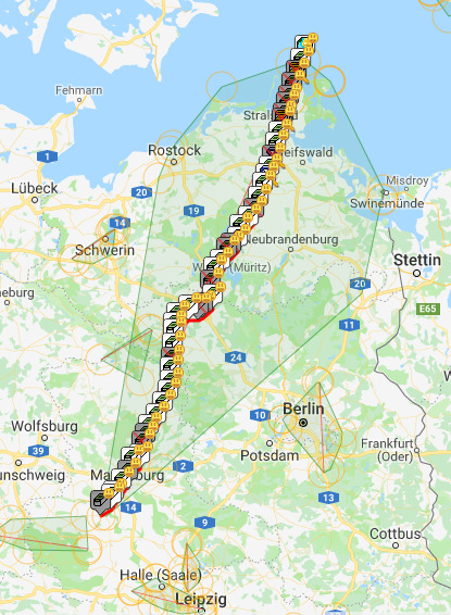 Die Aufgabe dieser Herausforderung besteht nun darin, dass der Luftlinienabstand vom ersten bis zum letzten gefundenen Cache mindestens 300 km betragen soll. Der Abstand zwischen den Caches darf dabei 10 km nicht überschreiten. Die Caches müssen zeitlich jedoch nicht power-trail-mäßig in dieser Reihenfolge, sondern an beliebigen Tagen gefunden worden sein. Der Cachetyp spielt dabei auch keine Rolle. So ähnlich könnte es aussehen: