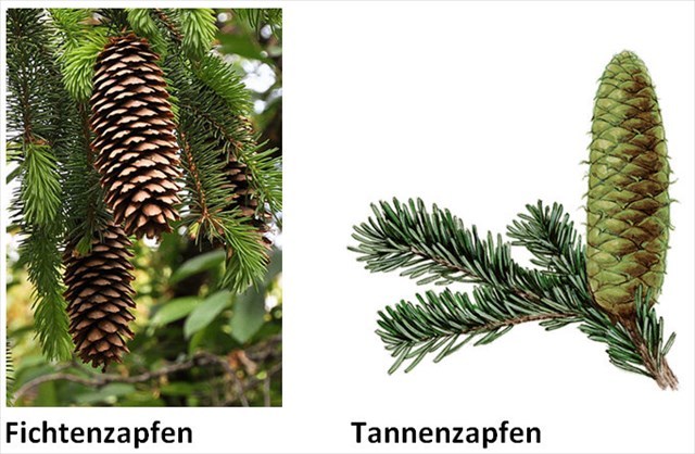 Die Zapfen von Fichten hängen an den Zweigen und fallen im Ganzen hinunter. Tannen besitzen dagegen aufrecht auf den Zweigen sitzende Zapfen. Diese fallen nicht im Ganzen hinab, sondern deren Schuppen einzeln. Alle „Tannenzapfen“, die man auf dem Boden findet, sind also Fichtenzapfen.