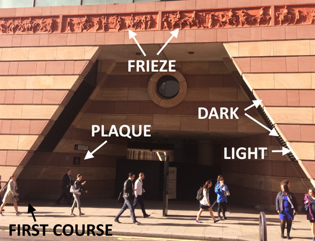 Number 1 Poultry is constructed using different geological materials, which help give it its polychrome appearance. Go to the co-ordinates and study the materials indicated on the image below, then answer the questions. You should be standing on the Poultry (north) side of the building under the arch.