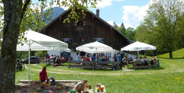 Zunächst wandert man entlang des Höllenbaches, die meiste Zeit durch Wald geschützt. Neben dem Weg befindet sich zahlreiche Quellen, aber keine Angst auf der Alm gibt es auch eine Hopfenkaltschale. Ein Sandkasten und Ziegen verkürzen den Kindern die Aufenthaltsdauer auf der Alm (und die Alten-Cacher können es sich bei Kaffee und Kuchen, Brotzeit und Radler gemütlich machen). Die Lebensmittel der Brotzeitkarte stammen übrigens alle aus eigener Herstellung, darunter Käse, Speck, usw.