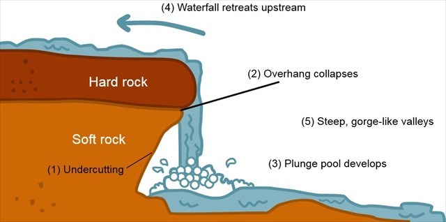 Vanligvis faller fossen som strømmer fra mykt berg til hardt berg. Dette fører til erosjon både langs bakken og der fossen treffer. I begge tilfeller eroderer den myke steinen, og etterlater en hard overflate der vannet beveger seg. Slik som dette: