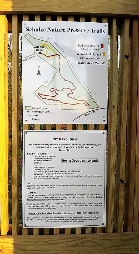 The SNP is 22.76 acres of forested hillside in the Washington City limits that was once a part of the 200 acre Schulze family farm. It is currently owned and managed by Ozark Regional Land Trust (ORLT). There are two hiking trails here. Preserve is open from dawn to dusk. This one should be a fairly easy park and grab. BYOP!