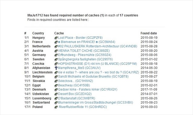 Bei dieser Challenge musst du nachweisen, dass du bereits Caches in zwei verschiedenen Ländern gesucht und gefunden hast. Der Cachetyp ist dabei irrelevant. Es gelten nur Länder, keine Bundesländer.