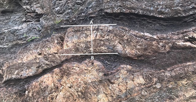 - Go to Waypoint 1! What type of folds can you observe there? Estimate the distance between A and B shown in the picture?