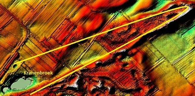 Nachstehende Höhenkarte zeigt deutlich die Überreste einer großen Parabeldüne in Het Marissen. Die Entfernung von der Deflationswanne, das Kranenbroek, bis zum Dünenkopf beträgt ca. 1100 Meter.