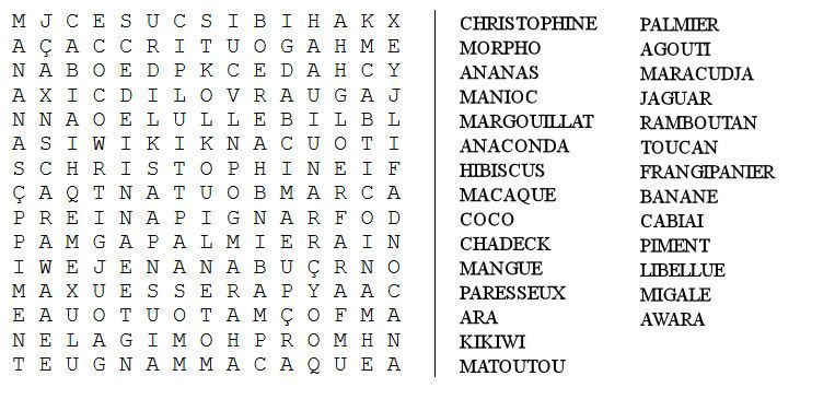 Pour trouver les coordonnées, il vous faudra résoudre cette grille de mots mélés. Un animal et un fruit ont oublié de s'y glisser