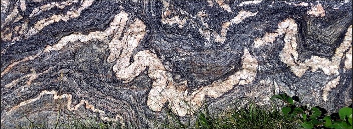 3) Ao olhar para Norte vê-se duas bandas, a formar um V, que resultaram do mesmo metamorfismo. Que largura tem a de maiores dimensões, ou seja, a que passa ao lado da marmita oval? Qual foi a direção das tensões que formou esse mesmo alinhamento da foliação? (norte-sul, este-oeste, nordeste-sudoeste, noroeste-sudeste)