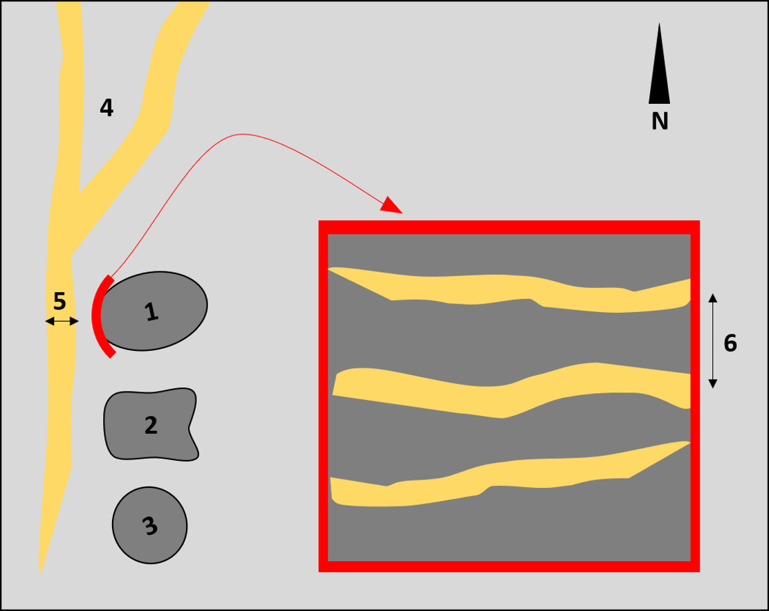 3) When looking towards the North one sees two bands, forming a V, which resulted from the same metamorphism. How wide is the largest one, that is, the one that passes beside the oval lunch box? What was the direction of the tensions that formed this same foliation alignment? (north-south, east-west, northeast-southwest, northwest-southeast)