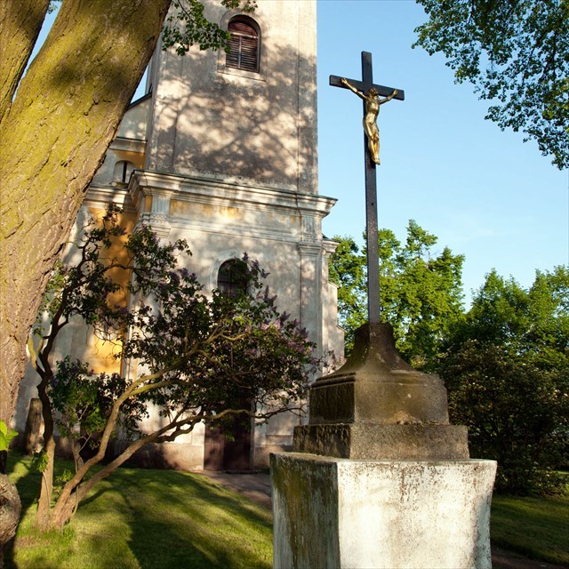 Boží muka umístěná na pískovcovém podstavci před kostelem pochází z roku 1830.