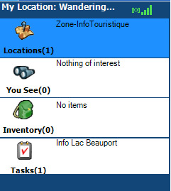 The game is also in English, just select English at the beginning of the game. The goal of the game is to discover places associated with Lac Beauport. In the cartridge you will have the instructions concerning the places to visit. You have tasks to perform which consist in going to 7 places to answer various questions. For each correct answer you will be given a clue that will appear in your inventory to help you discover the cache. The cache coordinates are given to you when you have completed all the steps.