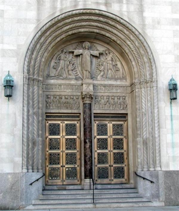 A pink granite is used around most of the base of the exterior. This stone not only adds color to the building, but also protects the base of the building. Even with modern coatings, Salem Limestone does not hold up well when it is subjected to large amounts of salt, as would the base of a building in an area where salt is used for ice control.