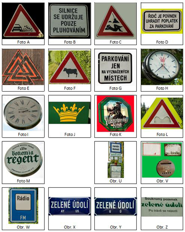 Vasim ukolem je urcit poradi, ve kterem potkate objekty na "Foto A" az "Foto M". Pismena z nazvu obrazku potom doplnite do nize uvedene tabulky, a to tak, ze prvni obrazek, ktery potkate na sve pouti, napisete na prvni misto tabulky (napr. C), druhy na druhe (napr. K)a tak dale.