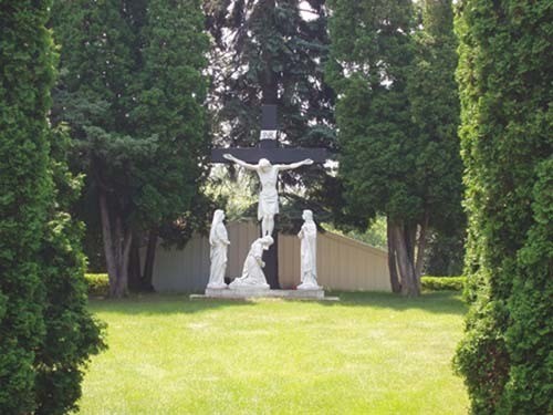 In 1851 land for this cemetery was donated by early settler Abraham Lambert. Dedicated in 1855, Saint John's Cemetery is the second oldest cemetery in Minnesota. It is located one block east of the church on Little Canada Road. Over one hundred members of pioneer families are buried in the oldest section near the entrance gate. The life-sized Crucifixion scene facing the gate provides the backdrop for the annual Memorial Day Mass in the cemetery.