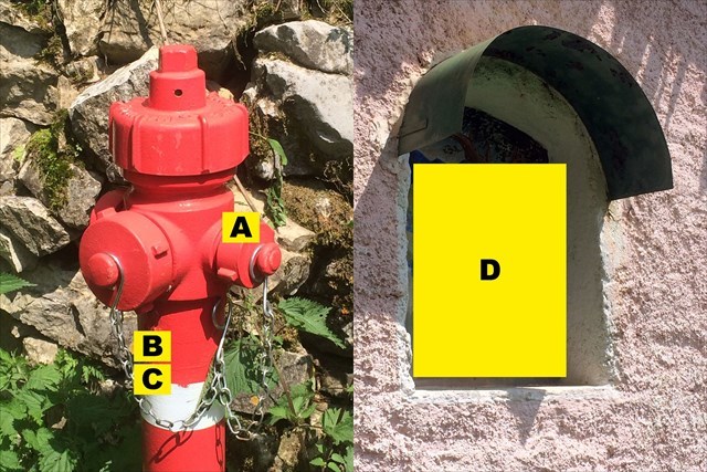 Alla vostra destra trovate un idrante su cui ci sono tre numeri che saranno A, B e C. Sulla sinistra invece si trova un edificio con un piccolo dipinto su una parete. Il numero di personaggi rappresentati nell'immagine sarà D.
