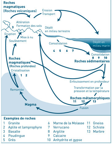Les roches se forment au cours d'un cycle continu, se transforment et se décomposent de nouveau. Les mouvements sont généralement si lents que nous ne les détectons pas. Il y a d’abord formation de massifs dont les roches s’érodent en surface. Ces massifs sont abrasés et les débris d’érosion entraînés par les cours d’eau. Ces débris s’accumulent ensuite sous forme de roches sédimentaires, qui peuvent être enfouies à de grandes profondeurs. Soumises à des pressions ou des températures très élevées, elles se transforment alors en roches métamorphiques. La roche en fusion ou magma se solidifie en profondeur ou en surface pour former des roches magmatiques, puis le cycle recommence.On a donc trois types de roche: les roches magmatiques, métamorphiques et sédimentaires. Les roches sont essentiellement constituées de composants minéraux, parmi lesquels des verres naturels. Elles peuvent aussi contenir des matières organiques telles que des résidus animaux ou des composants végétaux
