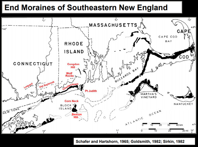 In simple terms, 22,000 and 120,000 years ago 2 glaciers formed Block Island off the coast of Rhode Island. The older of the two brought boulders and sediment from the north, what is now known as Narragansett Bay. The second, more recent glacier came from the northwest, Connecticut and southwestern Rhode Island. This one deposited a finer, silty sediment to the existing rockier build up. This formation is called a moraine.
