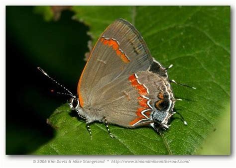 Red-Banded Hairstreaks are fast in flight and tend to stay lower to the ground than other butterflies. When resting with wings up, the bright swish of red-orange on their wings is highlighted by the same coloring on the edge of the wing by the head. A splash of bright blue near the rear of the butterfly can also catch your eye.