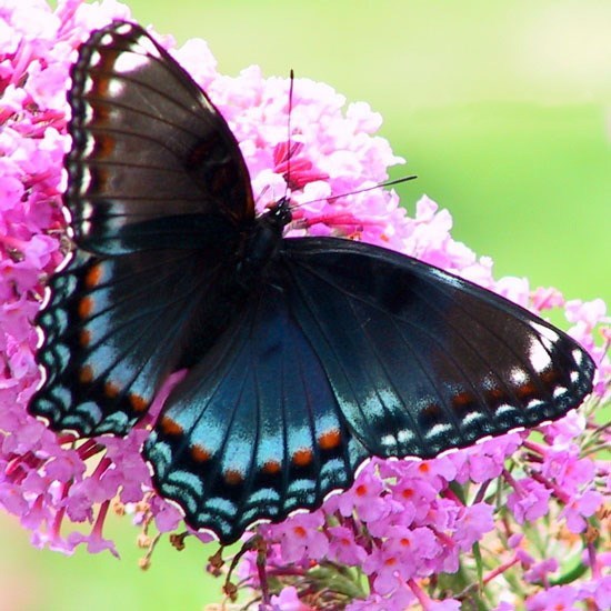 Look for Red-spotted Purple Admiral butterflies from spring through autumn. Adult butterflies drink nectar from flowers, water from puddles, tree sap and juices from rotting fruits.