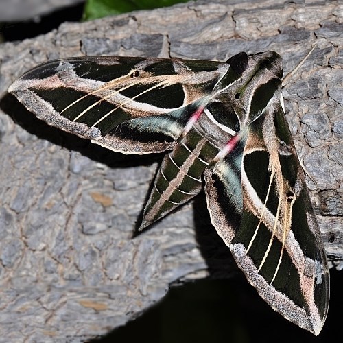 The Vine Sphinx Moth has a sleek, striking pattern of lines and stripes on its forewings that is best observed when they are open (flat). Its hindwings hide bright pink patches that are visible when the forewings are stretched out. It is a stark contrast from the neutral coloring along the rest of its body.