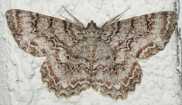 The brown and ivory coloring on this moth make it almost impossible to see when it is resting on tree bark. Its wings remain completely flat so it has a low profile. The zigzag patterns and scalloped edges blend in with the variations on a trunk. Though fond of tulip trees, this species' caterpillar also feeds on the leaves of yellow poplar, paw-paw, red bay and sassafras trees. Adults are active from mid-spring through the summer and into early autumn in some regions. They are attracted to lights.