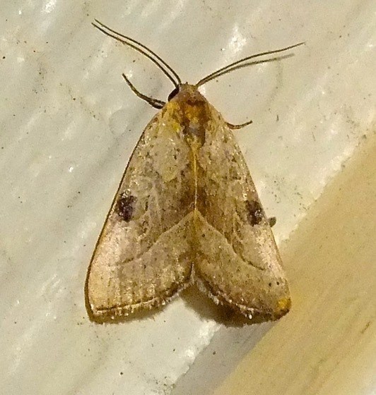 The Wedgeling is a type of Midget moth. It is quite small and comes in different shades of brown ranging from light to dark. They are marked by a dark smudge on the middle part of each forewing near the outer edge. Their caterpillars are a tawny, or dark brown depending on maturity and size with thin white lines that help give it the appearance of an unusually large head. These larvae feed on Shamrock plants in the Oxalidaceae family.