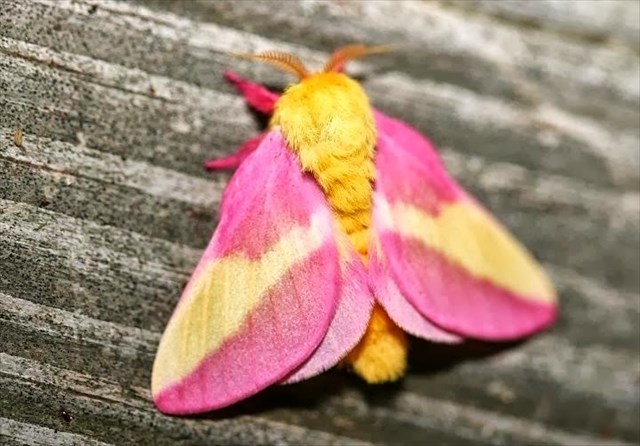 The pink and yellow, bright and furry Rosy Maple prefers maple trees when housing and feeding its caterpillars.