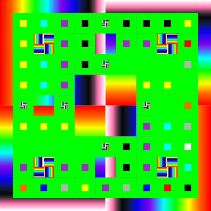 The Sierpinski Curve is a mathematical plane and a 2D generalization of the Cantor Set. It is a base modal fractal where the initiate is subdivided into 3X3 grids and removing the middle one sequentially. The motive I like most is the Sierpinski 3, which is a three-time subdivision of the initiate fractal, giving a 9X9 grid - much like our Geocaching D/T rating grid of 9X9. I obviously added some color to the grid based on my own D/T matrix so far, but not necessarily following the standard layout on 1.0 / 1.5 / 2.0 / 2.5 etc...... By using your colorful interpretation you will be able to get the coords to the cache