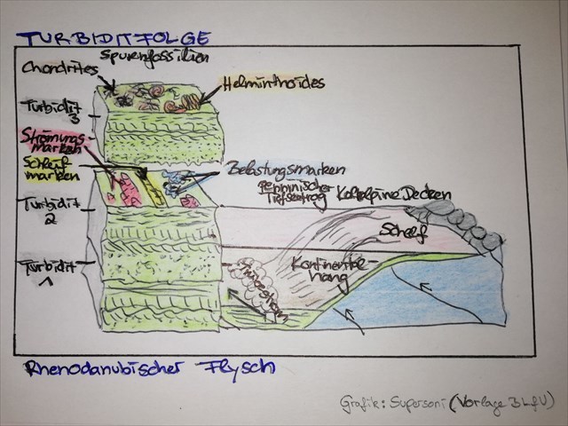 Derartige Meeresablagerungen bezeichnet man als Turbidite (=aus Trübestrom am Tiefseeboden entstandenes, meist rhythmisch geschichtetes Sedimentgestein), die aufgrund ihrer Ausbildung überwiegend auf sehr weite Transportwege am Tiefseegrund schließen lassen. So zeigen heutige Beobachtungen in den Weltmeeren, dass derartige Trübeströme Entfernungen von mehreren tausend Kilometern zurücklegen können.