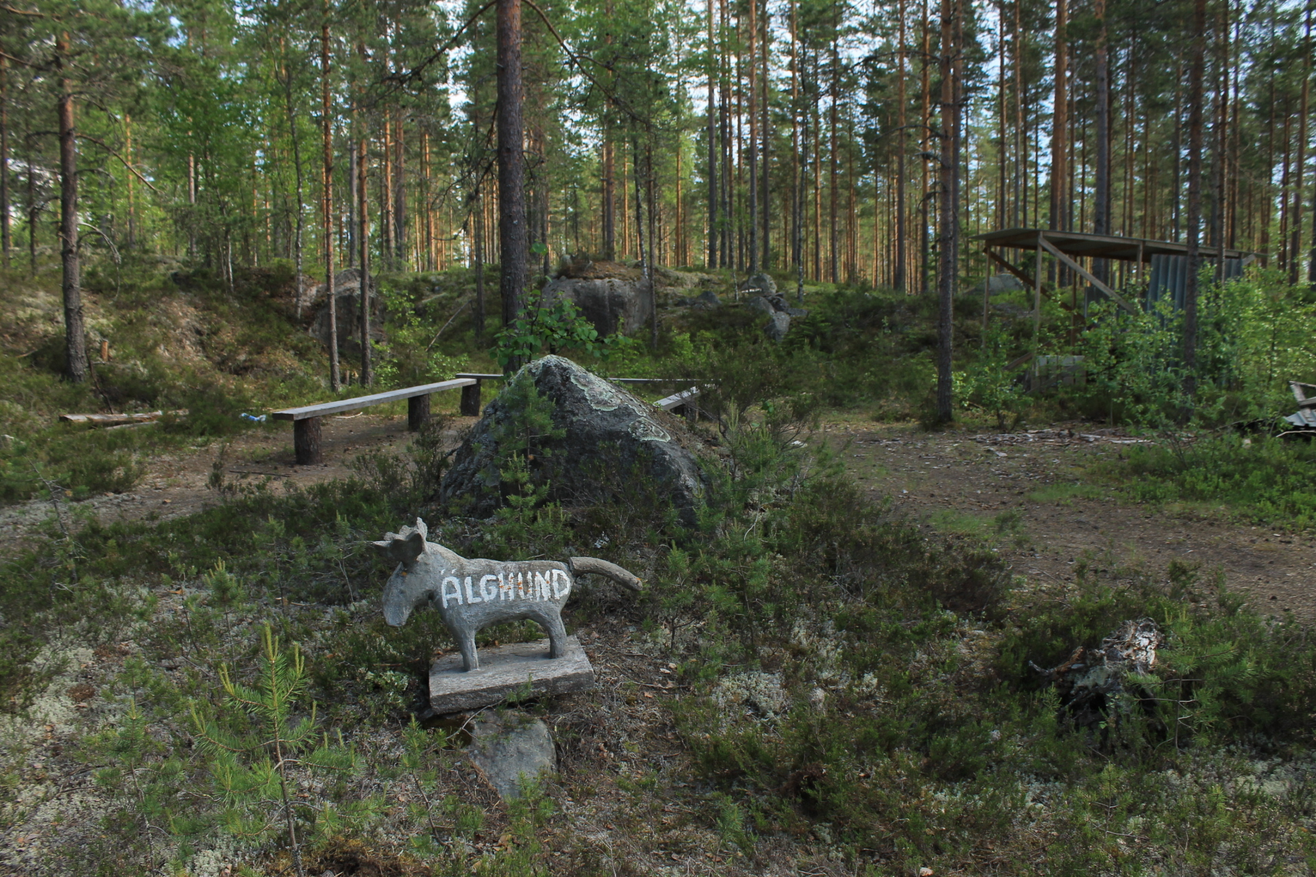 Efter att ha varit och lagt ut en cache vid Fräkensjömyrarna så passerade jag här på tillbakavägen. Här fanns då något som drog till sig min uppmärksamhet - en Älghund, då tyckte jag att det passade bra med en cache här.