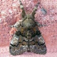 Like many Tussock moths, the Manto Tussock Moth has bristled bumps and furry striped legs. The dark wings of the male contrast with lighter wings seen in females. Shades of brown, gray and copper cover males. Large, feathery antennae curve toward the body when resting with wings flat. Tawny brown patches on the forewings are surrounded by white. In warm conditions, females can produce up to three broods in one year. Caterpillars feed on the needles of various pine trees. They are covered with long hairs that are white, black and red. Two long, black tufts of hair extend like antennae near the head. The upper part of the body ('torso') is covered in humps on the dorsal side (back). Three long extensions of dark hairs reach out and away from the rear of the larva. Behavior and life history is unknown for this species despite its expansive range.