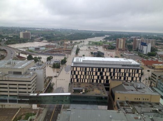 The most devastating flood to this area in historical record was the 2013 flooding. On June 19, 2013, more than 200 millimetres of rain poured on the snowpack over two days. The year’s heavy winter snowpack, a cool spring, and substantial June rain sent most of the year’s water supply down the rivers. This deluge not only affected what we see of the Bow and Elbow, but also their subterranean waters known as aquifers, which rose up into many homes and buildings. The water's murky appearance was from the force of the rivers pushing upriver silt and sediment downsteam. This is what the confluence area and East Village looked like after the flooding: