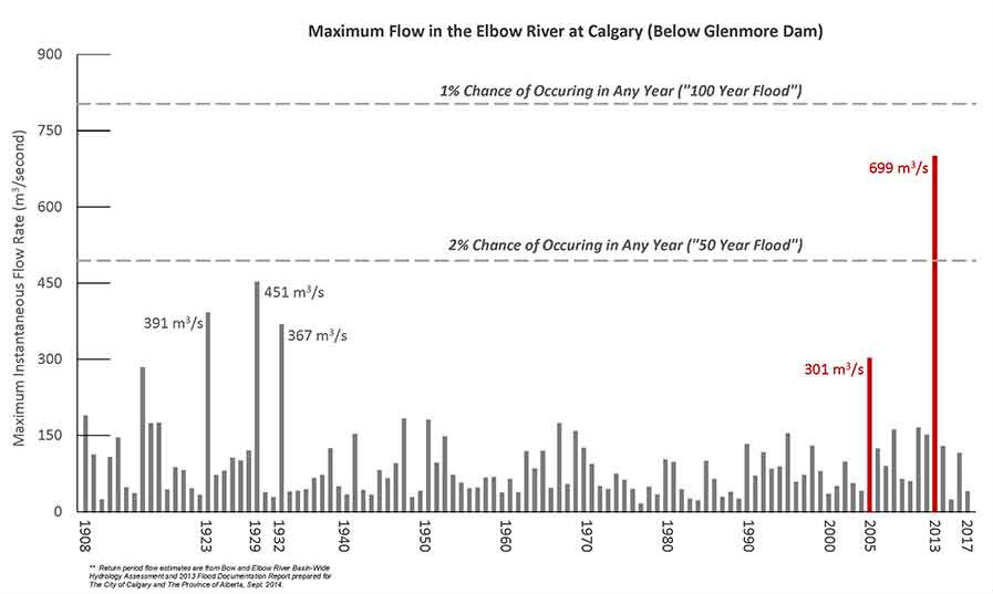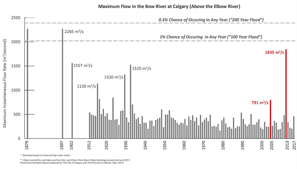 While the floodplains are generally beautiful places to play, work, and live on, they also come with the eponymous hazard of being floodplains. Flooding data have been kept on both the Bow and Elbow Rivers since 1870. The graphs below show the water flow rates on the rivers.