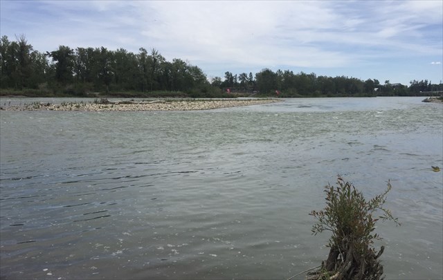 If you were here before development happened along the Bow River and in the floodplains and the disappearance of Goose Island, the appearance of the Bow's waters would also be different. In the summer, the Bow was a deep turquoise with glacial silt. During the fall, the waters would recede as cooling temperatures slowed the headwater glacier melt. Wintertime would find the waters shallow: they would freeze on top, and water would flood over top of the ice. Now, because of about a dozen dams upstream, the Bow usually flows more evenly throughout the year and much of the glacial silt is left behind in the dams. There is less water in summer and more in winter.