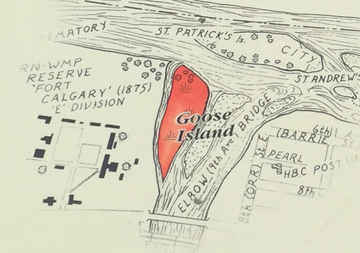 1) What evidence do you see on the land at GZ that indicates human activity is again altering the land of the former Goose Island? OR If ground conditions such as snow and ice don't allow you to see the what's happening on the land at GZ, estimate in metres the width of the Elbow River where it starts to empty into the Bow.