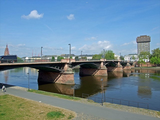 Die Brücke entstand 1876 bis 1878 als Obermainbrücke nach einem Entwurf von Peter Schmick als fünfte Mainbrücke in Frankfurt.