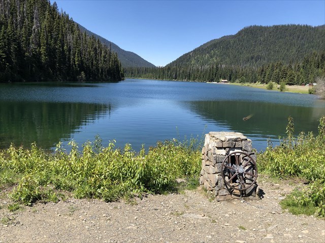 Lightning Lake is freshwater, very cold, and has an unusual feature — it drains in two directions! Yep, it drains into Flash Lake to the south and the Similkameen River to the north. At the north end, near the day-use area, there’s an earthen dam that was installed in 1968. You’ll cross this dam on your way to ground zero, which is near the Mount Frosty trail head.