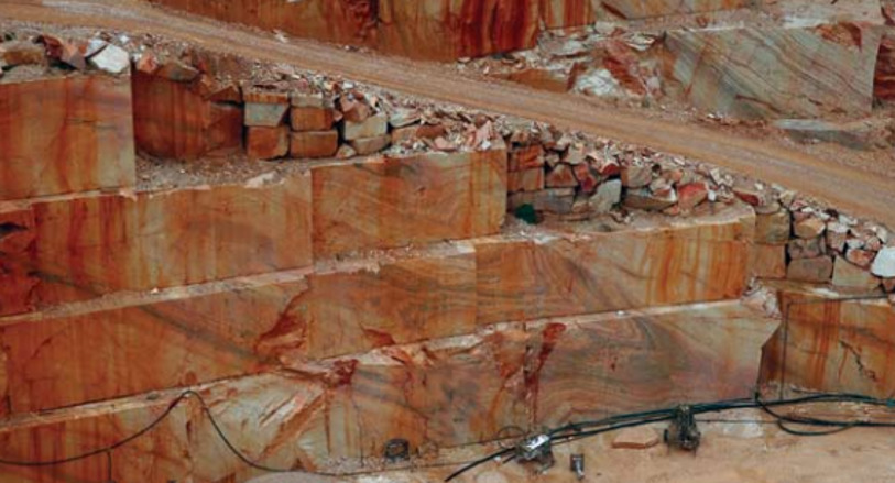 5) No quinto bloco virado a nascente há uma banda mais visível a sensivelmente 2,7 metros de altura. Está na segunda tira vertical no sentido sul-norte e já na parte não polida. Na dúvida consultar a foto spoiler e tirar uma foto de modo a observar mais perto a banda. Os cristais dos minerais recristalizados são menores do que os da mármore envolvente? Qual a sua cor predominante? Porque razão apresentam uma cor mais destacada? Justifique adequadamente as suas respostas.