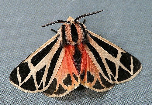 The Harnessed Tiger Moth could be mistaken for a butterfly with its stripes, contrasting colors and splashes of orange underneath.