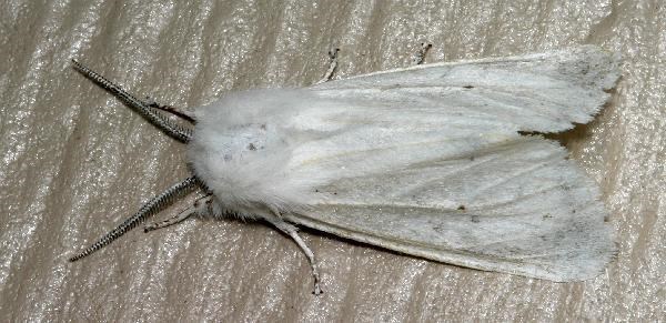 The Fall Webworm is a moth that comes in two colors: all white in the north, or white with brown patches (almost like a giraffe) in the south. The pronotum is hairy. Legs are white, or orange with brown on them. The name stems from its larval form, a caterpillar that spins a silky web with its newly hatched siblings. These webs can cover twigs, branches or even entire trees. It acts as a barrier, allowing the caterpillars to feed on the leaves of the host plant with a good degree of protection from predators. Both versions are now present in Europe and Asia. First sightings of them out of their native range began in the 1940's.