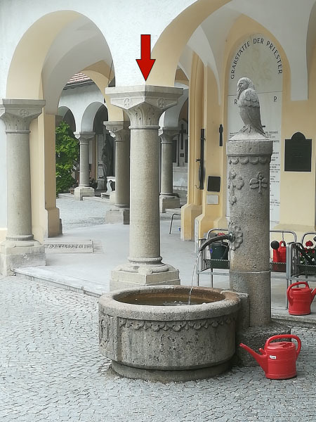 Trete ein paar Schritt zurück und blicke Richtung Brunnen. Die Säule hinter dem Brunnen verdeckt ein Grabmal.