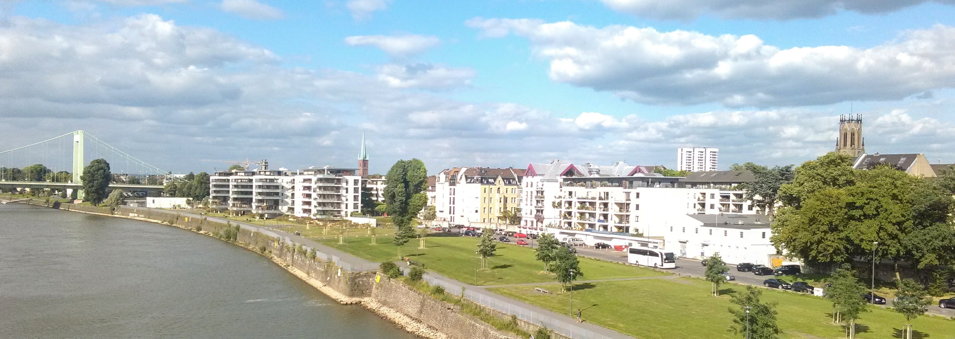 Man hat hier einen schönen Blick über den Mülheimer Hafen hinüber nach Deutz und bis zum Dom. In der anderen Richtung schaut man auf Rhein, Mülheimer Brücke und die St. Clemens Kirche.