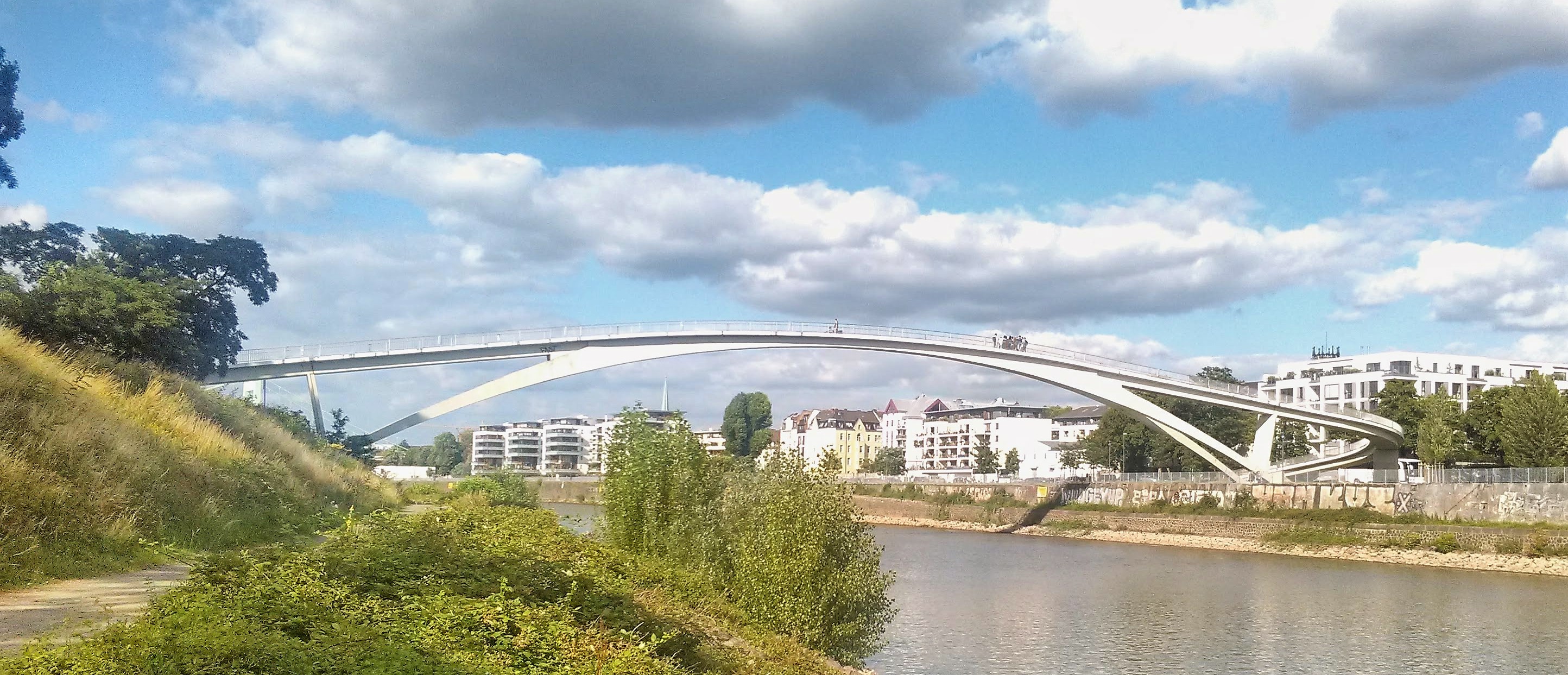Die Fußgängerbrücke über der Hafeneinfahrt wurde bereits 1955 anlässlich der Kölner Bundesgartenschau im Jahr 1957 nach einer Idee des Brückenbauers Gerd Lohmer von Architekt Bernhard Hermkes konstruiert.