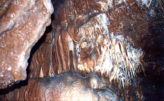 Certaines cavités présentent des coulées, fistuleuses, stalactites, planchers ou stalagmites. Ces concrétions sont dans les tons bruns, à rouge, résultant de la présence d’oxydes de fer.