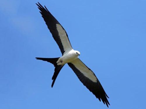 Swallow-tailed Kites spend most of their time in the air, capturing and swallowing their food in flight. Rarely flapping their wings, they soar and make tight turns, rotating their tail to steer. They are very vocal when alarmed or when clashing with other members of their own species. Breeding pairs appear to be monogamous, and they may either pair up during migration or carry over their relationship from previous years. They establish small territories around and above the nest, and maintain them by flying silently in circles above the nest tree. Intruders are chased with loud scolding. Multiple pairs may nest near each other in “neighborhoods,” and nonbreeding birds often hang around carrying food and nest materials to breeding females (which reject the gifts). Swallow-tailed Kites often roost communally near nests, and right before migration hundreds of kites may roost together.