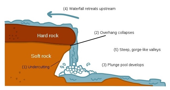 When the river courses over resistant bedrock, erosion happens slowly and is dominated by impacts of water-borne sediment on the rock, while downstream the erosion occurs more rapidly. As the watercourse increases its velocity at the edge of the waterfall, it may pluck material from the riverbed, if the bed is fractured or otherwise more erodible. Hydraulic jets and hydraulic jumps at the toe of a falls can generate large forces to erode the bed, especially when forces are amplified by water-borne sediment. Horseshoe-shaped falls focus the erosion to a central point, also enhancing riverbed change below a waterfalls. Sand and stones carried by the watercourse therefore increase erosion capacity. This causes the waterfall to carve deeper into the bed and to recede upstream. Often over time, the waterfall will recede back to form a canyon or gorge downstream as it recedes upstream, and it will carve deeper into the ridge above it. The rate of retreat for a waterfall can be as high as one-and-a-half metres per year.