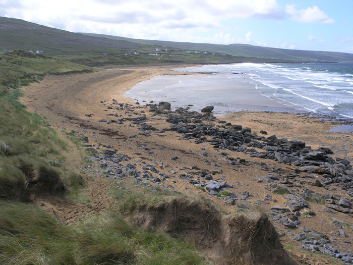 The limestone bedrock that is exposed on and around the beach is known as the Black Head member. Close examination will reveal that it contains abundant fossils such as; crinoids, brachiopods and corals. Like most of the limestone in the Burren these rocks were formed in a shallow tropical sea over 330 million years ago.