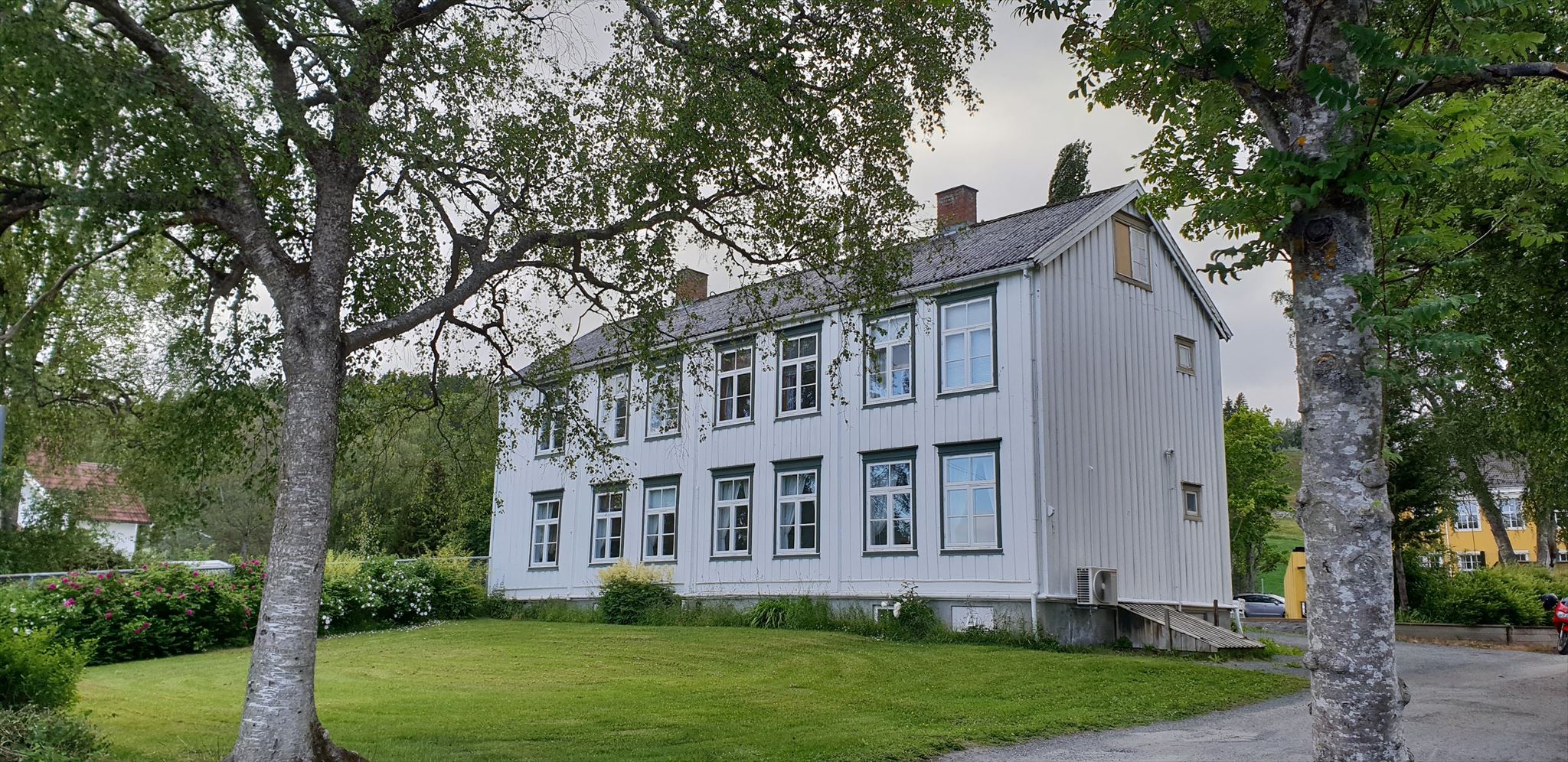 Near the cache one can see an old wooden whote building. That is the old old school bulding for the Straumen area. Behind it one can see a yellow building. That is the old school. On the other side of the road, one can see a big brown modern building, which is the current school. The white building now serves as a gallery and community centre. The yellow building now serves as a business park for creative businesses, intro programme classrooms and a volunteer´s central.